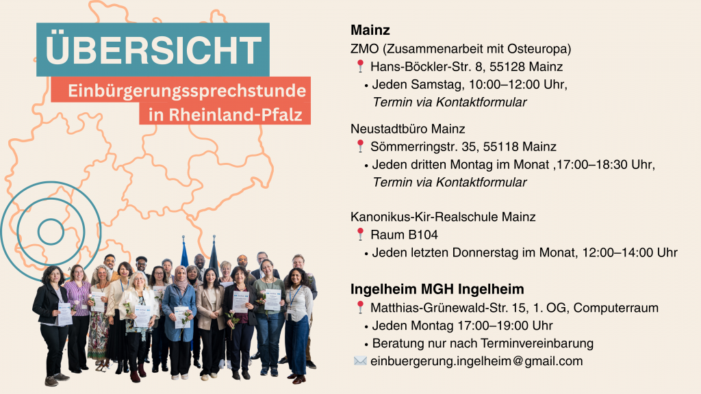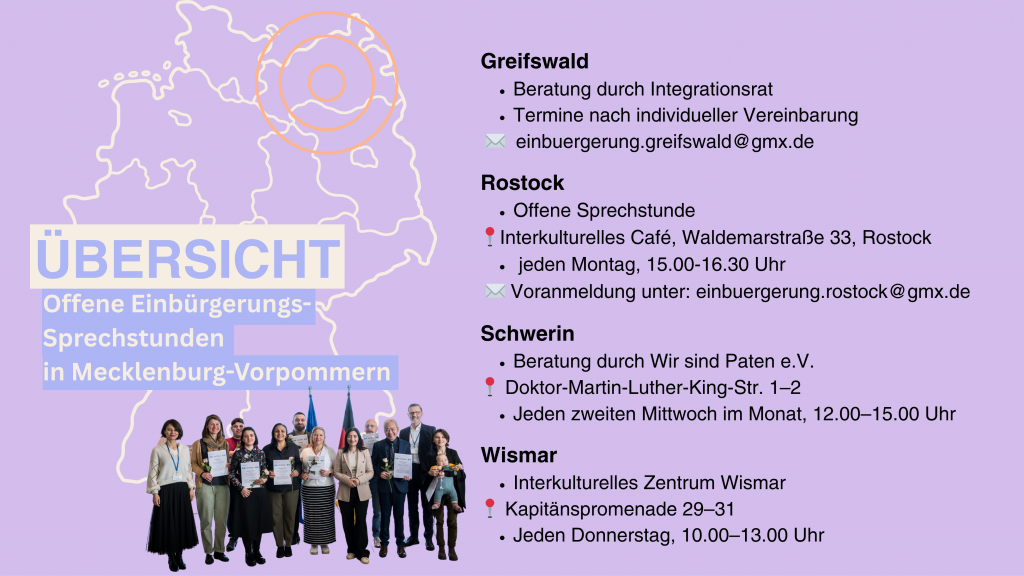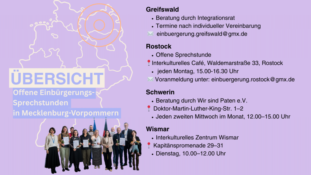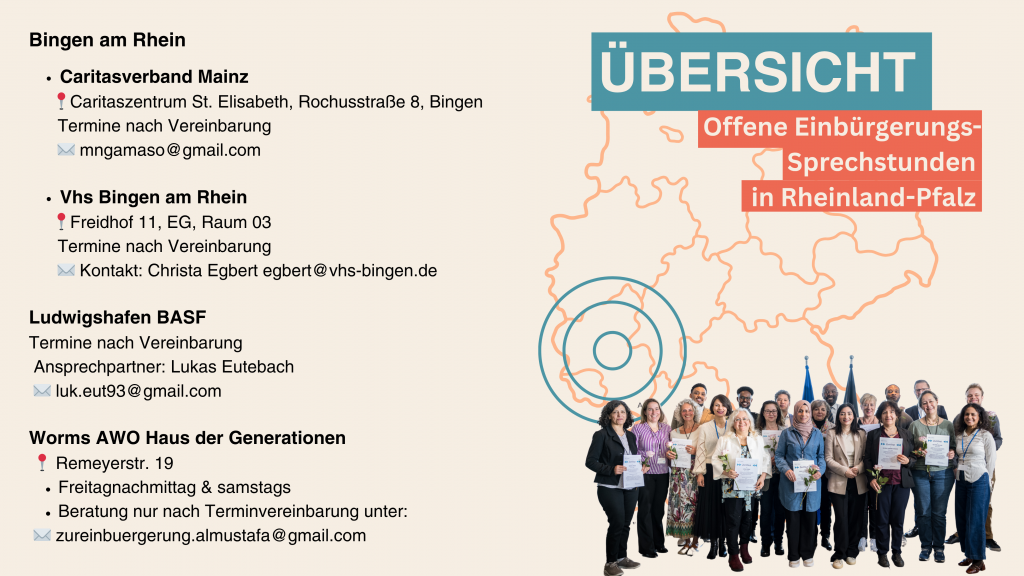 Du wohnst in Rheinland-Pfalz oder Mecklenburg-Vorpommern und interessierst Dich für Einbürgerung? Unsere Mitarbeiter*innen vor Ort informieren Dich zu den Voraussetzungen und beantworten Deine Fragen. Ehrenamtlichen Lots*innen bieten mehrsprachige Unterstützung bei der Antragsstellung und begleiten Dich zu Behörden. Die Beratung ist kostenlos.