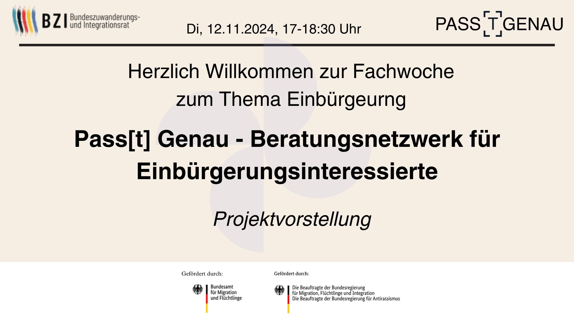 Am 27. Juni 2024 trat die Reform des deutschen Staatsangehörigkeitsrechts in Kraft. Die damit einhergehenden Änderungen umfassen unter anderem die Möglichkeit, mehrere Staatsbürgerschaften zu behalten, sowie eine Einbürgerung ab 5 anstatt wie bisher ab 8 Jahren. In den vergangenen Monaten ist die Nachfrage nach der Einbürgerung stark gestiegen (Quelle: s.u.). Das spüren auch die Projekt-Teams von Pass[t] Genau in Mecklenburg-Vorpommern und Rheinland-Pfalz: täglich gehen mehrere Beratungsanfragen von Einbürgerungsinteressierten ein, die sich Unterstützung in der Antragstellung wünschen. Diese Dringlichkeit und die Veränderungen durch die Reform nahm der Bundeszuwanderungs- und Integrationsrat e.V. zum Anlass, zusammen mit Pass[t] Genau eine digitale Fachwoche zum Thema Einbürgerung durchzuführen. Vom 12.11. bis zum 14.11.2024 fanden unterschiedliche Veranstaltungen statt, die sich alle mit verschiedenen Aspekten der Einbürgerung befassten.