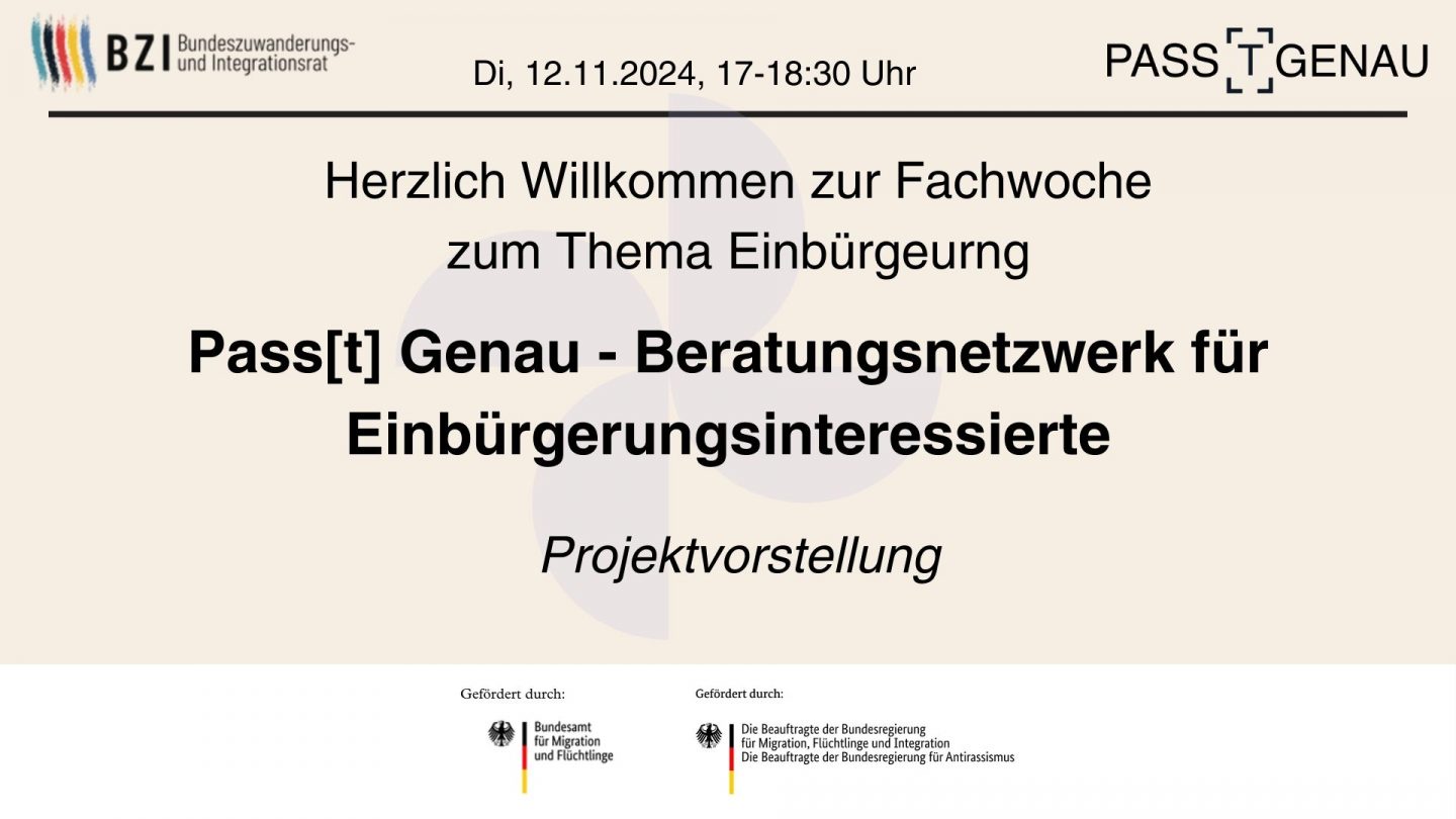 Den Abschluss der Fachwoche machte die Fachveranstaltung “Frauen im Einbürgerungsprozess: Hürden und Bedarfe”. Herr Dr. Gülzau vom SVR gab zunächst einen kleinen Input zu Daten, Herausforderungen und dem reformierten Staatsangehörigkeitsgesetz mit Blick auf Frauen. Es wurde hervorgehoben, dass in den letzten drei Jahren mehr Männer als Frauen eingebürgert wurden. So gibt es geschlechtsspezifische Unterschiede bei der Erfüllung der Einbürgerungsvoraussetzungen u.a. aufgrund von Sorgearbeit. Besonders vulnerable Gruppen sind außerdem Alleinerziehende, die zum einen ein hohes Armutsrisiko haben und zum anderen nun bei der Erhaltung von staatlichen Leistungen gemäß der Reform nicht mehr die Voraussetzungen für die Anspruchseinbürgerung erfüllen. Frau Dr. Shafahi, Einbürgerungslotsin bei Pass[t] Genau und Frauenrechtlerin, berichtete im Anschluss daran von ihrer Arbeit mit Frauen und deren Lebensrealitäten. Frau Dr. Shafahi wird demnächst mit einer Sprechstunde extra für Frauen beginnen, um diese gezielt im Einbürgerungsprozess zu unterstützen. Insgesamt hat die Veranstaltung gezeigt, dass es nur wenig Forschung zu Frauen und Einbürgerung gibt, dass gerade durch die Reform jedoch Frauen im Blick behalten werden sollten. Pass[t] Genau bedankt sich bei allen Referent*innen und Teilnehmenden für diese gelungene und sehr aufschlussreiche Woche!