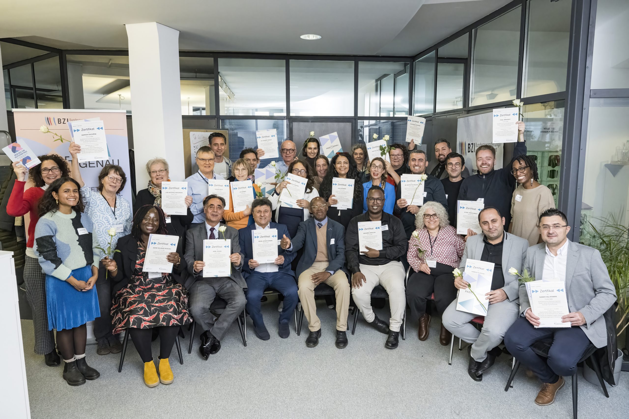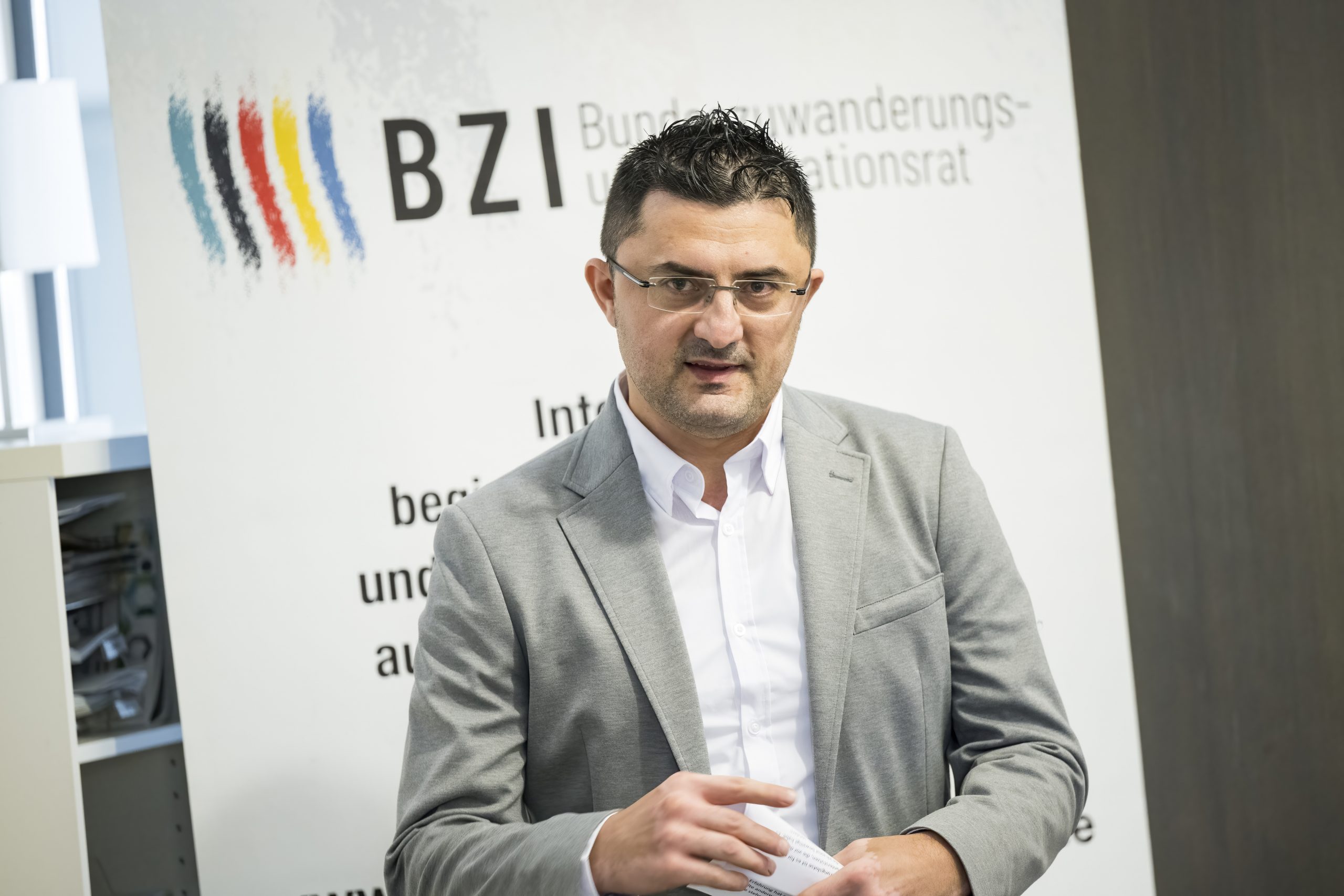 Samer Haj Khamis, Einbürgerungslotse aus Mecklenburg-Vorpommern, spricht in seiner Rede bei der Zertifikatsübergabe am 11. Oktober in der BZI-Geschäftsstelle, über die Bedeutung der Einbürgerung für ihn persönlich und seine Motivation, jetzt selbst andere Menschen bei der Einbürgerung zu unterstützen.